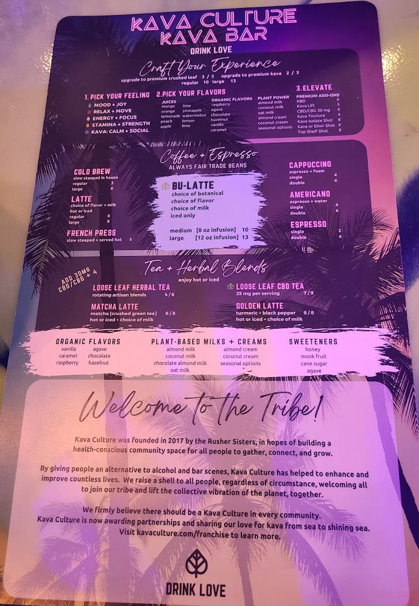 Overall, Kava Culture Estero balances indulgence and wellness, with a menu that highlights bold names, vibrant flavors, and a wide variety of serving styles-from espresso shots to functional teas, kava elixirs, and bottled beverages-ensuring there’s something for every mood and preference. The careful curation of beverages, from Botanical Brewing Sparkling Teas to Mixed Drinks - Fiji/Elixir, makes it a destination not just for a quick refreshment, but for a memorable, flavorful experience.
