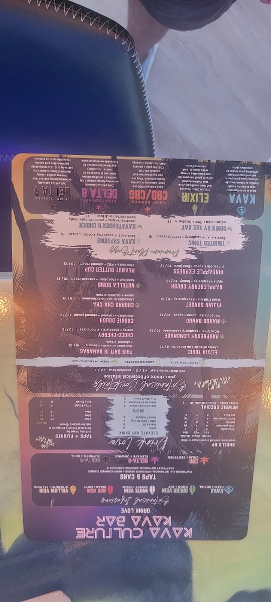 For those exploring kava-based beverages and adaptogens, the menu features Rhino Dart, KBD, Kava Lift, Vesl Oil G Watermelon, and Vesl Oil G Cinnamon, alongside bottled options like Blueberry Lemonade Can, Tiki Apple Can, Peach On The Beach Can, Orange Dream Can, and Perfect Pear Can. Mixed drinks, such as Churro Cha Cha, Nutella Bomb, Rappleberry Crush, Mango Bango, and Raspberry Lemonade, combine playful flavors with kava’s relaxing effects. Specialty drinks like Kava Supreme, Twisted Tonic, and Down By The Bay showcase the creative range of the menu, while Fiji and Elixir variations like Fijian Sunset, Pineapple Express, and Elixir Tonic expand the offerings for adventurous palates.